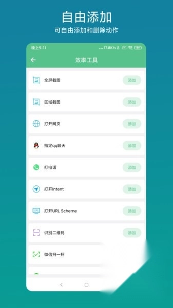请从功能列表里挑选您所需的功能,像全屏截图、区域截图、打开常用、扫一扫、收款码、付款码、打开手机系统设置之类的都可以。