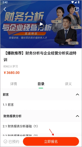 你可以先大致了解课程的基本信息,通过目录和讲义明确学习范围,然后点击下方的“预约课程”按钮。