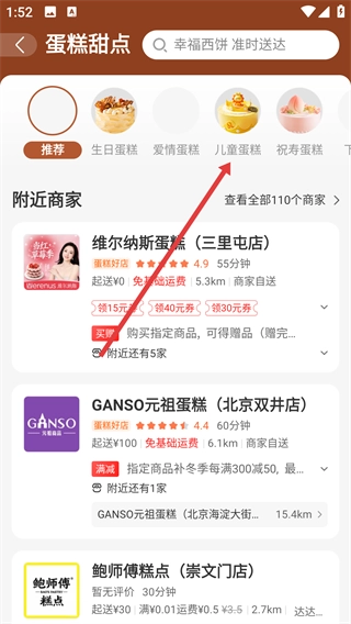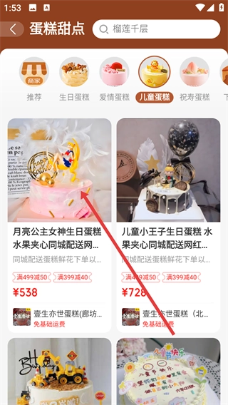 在蛋糕甜点专区中,点击【儿童蛋糕】分类选项,即可进入儿童蛋糕的列表页面,进而浏览查看适合儿童的各类蛋糕款式。