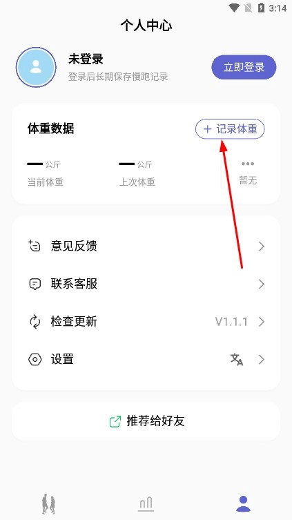3、运动后,切换到统计页,查看总时长、步数等数据,进入个人中心,点击记录体重录入体重,实现锻炼目标。
