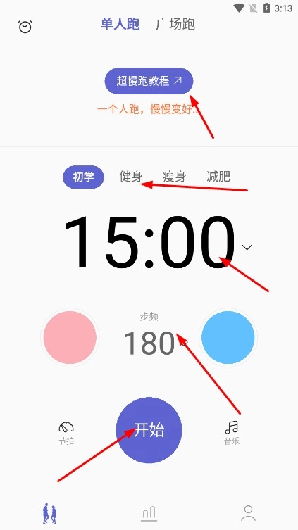 2、在运动设置页,选单人跑或广场跑,点击超慢跑教程学方法,选目标,设置时长,步频,点击开始开启超慢跑。