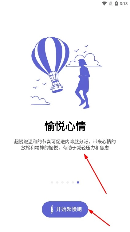 1、打开一起超慢跑,了解超慢跑健康瘦身、愉悦心情等优势,点击下一页,开始超慢跑,进入功能页。