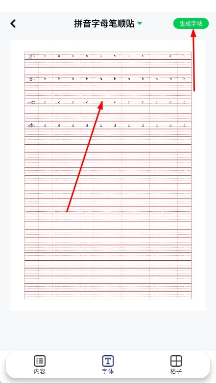 3、点击生成字帖,获取带笔顺的拼音字帖,结合拼音启蒙动画、趣味拼音内容,学习声母、韵母,提升拼音学习效果。