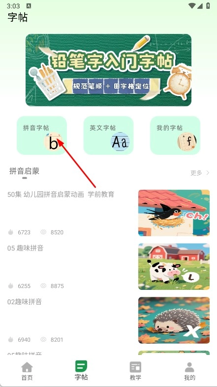1、打开汉语拼音发音点读软件,点击底部字帖,进入字帖页面。