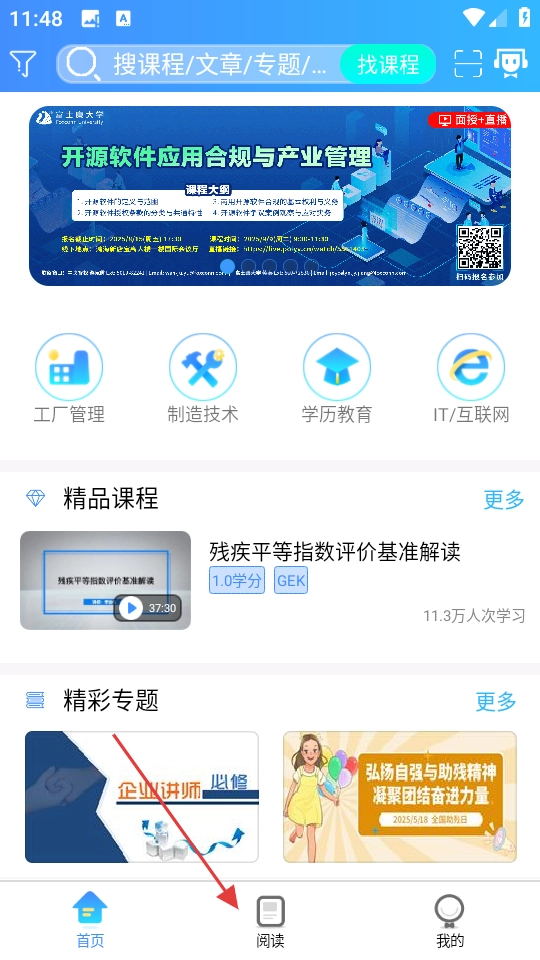 1、在首页点击底部阅读,进入阅读页面。