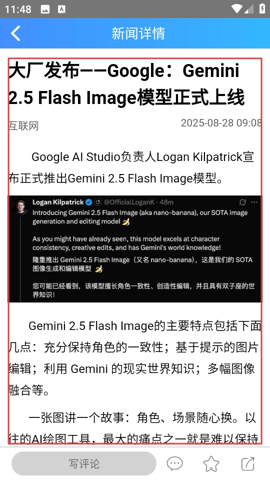3、进入新闻详情页面后,你可以阅读里面的内容,也能够撰写评论,还能进行收藏和分享操作。