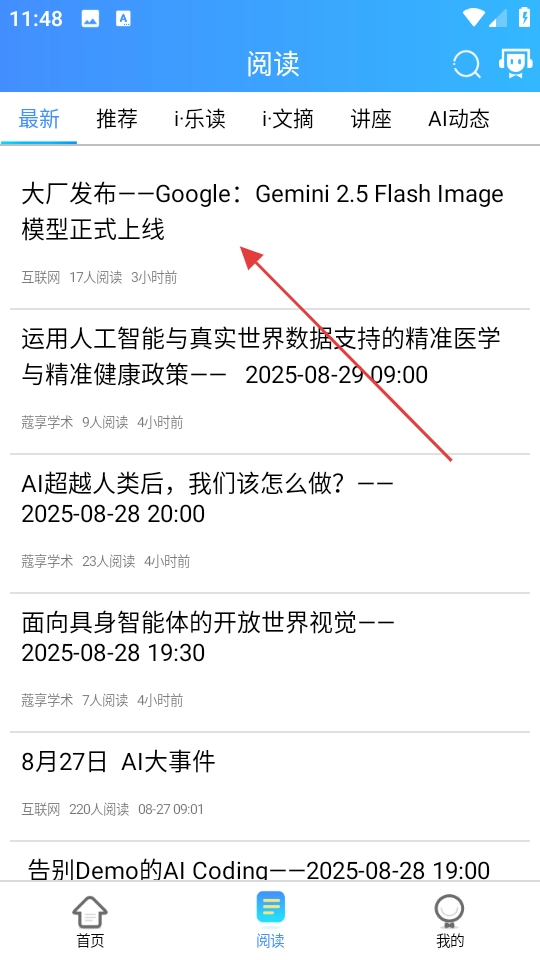 2、在阅读页面挑选自己感兴趣的文章,例如大厂发布的模型正式上线这类内容。