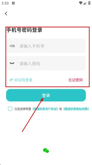 3、进入手机号码密码登录页面,依次填写手机号与密码,勾选相关协议后,点击登录按钮,即可完成账号登录流程。