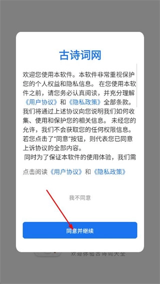 在古诗词网的协议弹窗里,点击“同意并继续”按钮,即可进入网站首页。