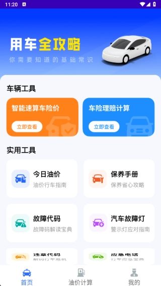 首页配备了智能速算险价、车险理赔计算功能,以及各类实用工具。
