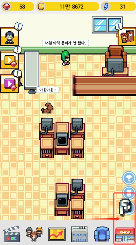 3、看办公室场景,点右下角红框店铺图标继续游戏。