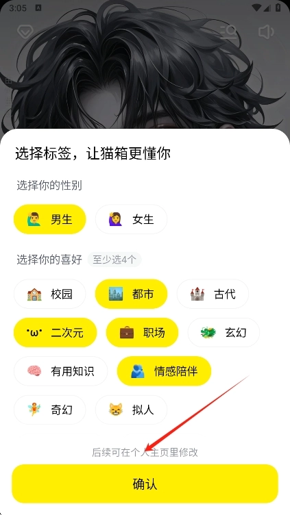 1、打开猫箱AI聊天,挑选你的标签,标签数量需不少于4个,然后点击确认;