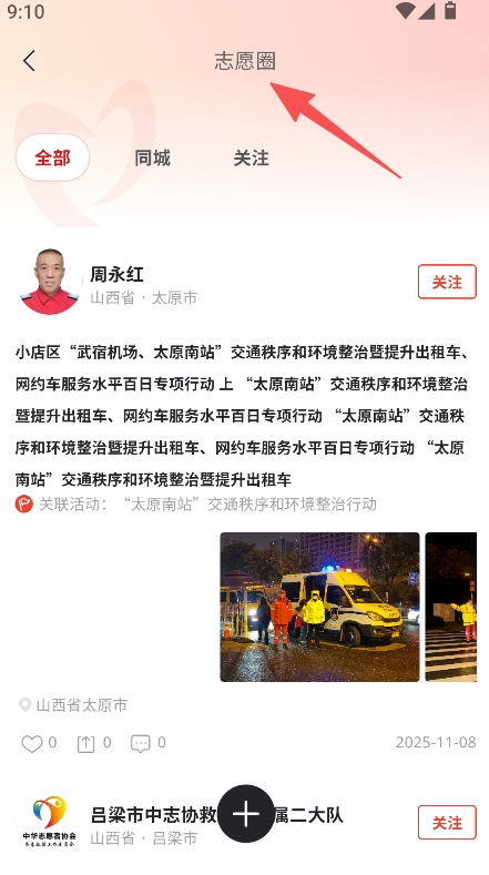 板块分层清晰明了,志愿圈(全部、同城、关注)与发布功能的环节设置明确,能够适配不同的公益场景,有助于提升公益参与的效率。