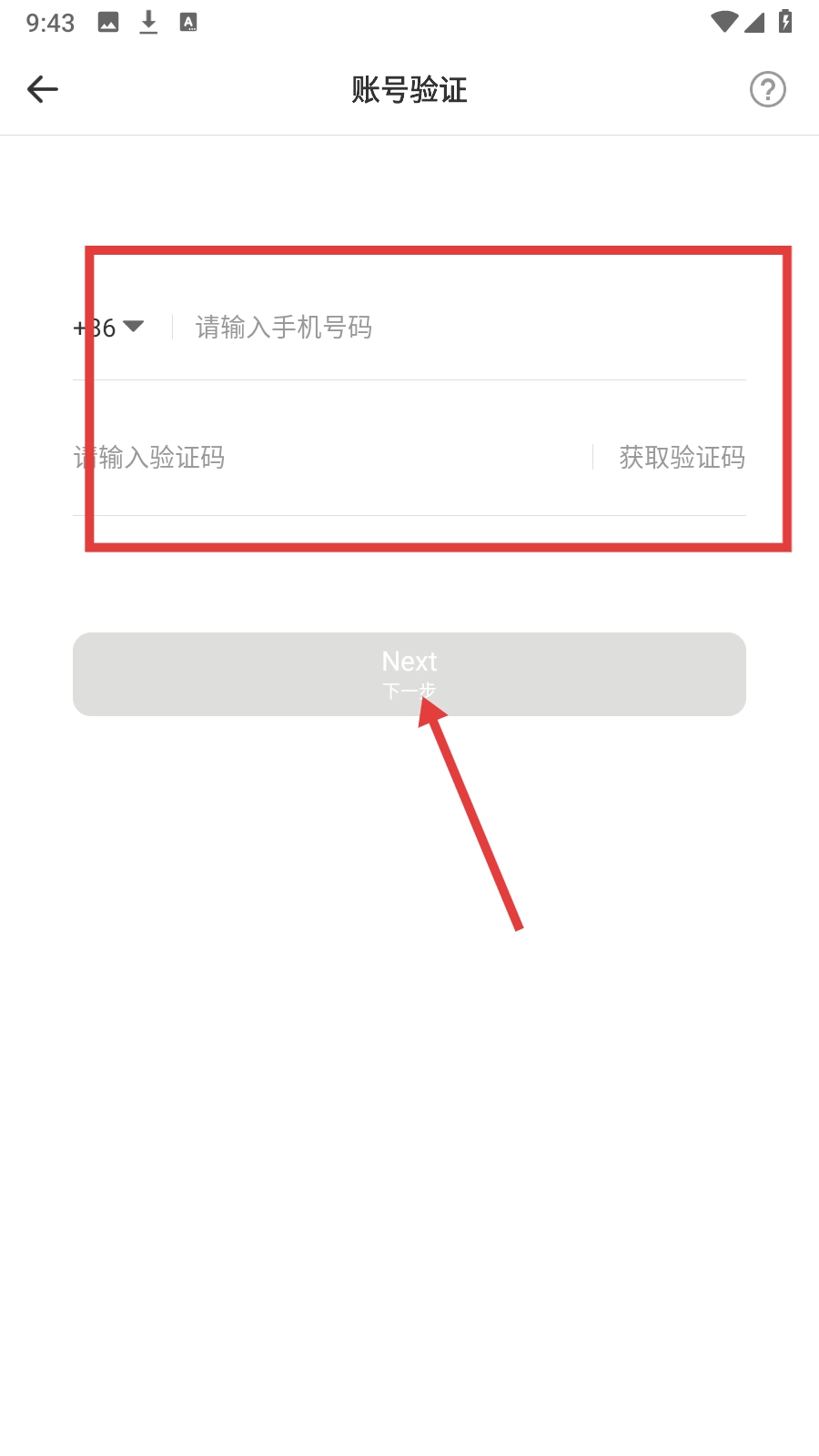 在账号验证页面填写手机号与验证码,点击【下一步】按钮,就能完成验证流程。