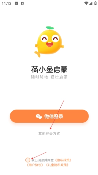 在荷小鱼启蒙的首页,先勾选【协议】,再点击【其他登录方式】来切换登录选项。