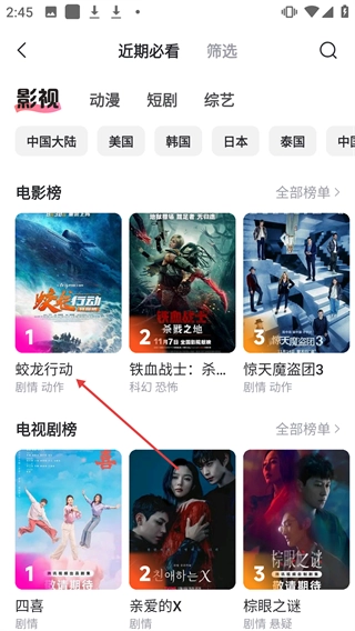 在近期值得关注的电影榜单里,点击【蛟龙行动】就能进入它的详情页面。