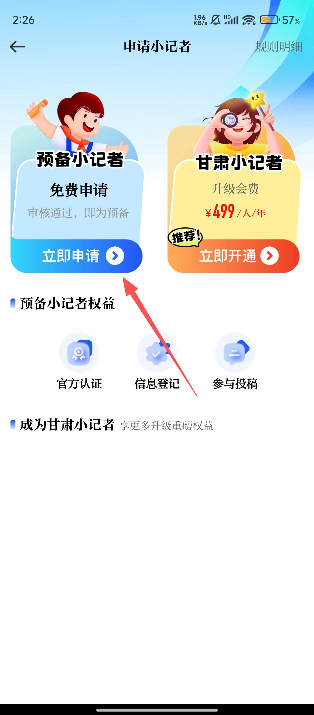 进入小记者申请页面后,点击【预备小记者-立即申请】选项,即可免费提交申请,待审核通过就能成为预备小记者,还能享受丰富权益哦。