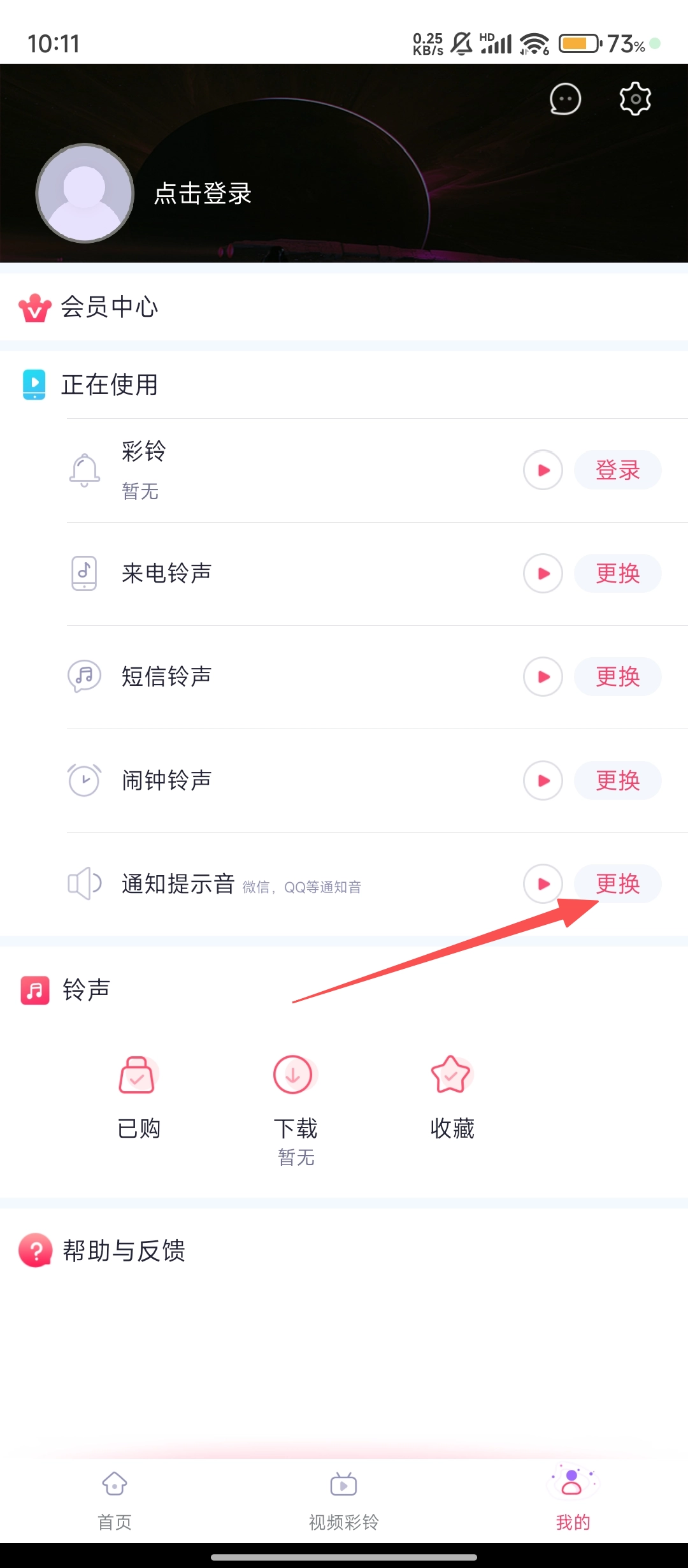 在个人中心页面,找到【通知提示音】右侧的【更换】按钮并点击,即可进入更换页面。