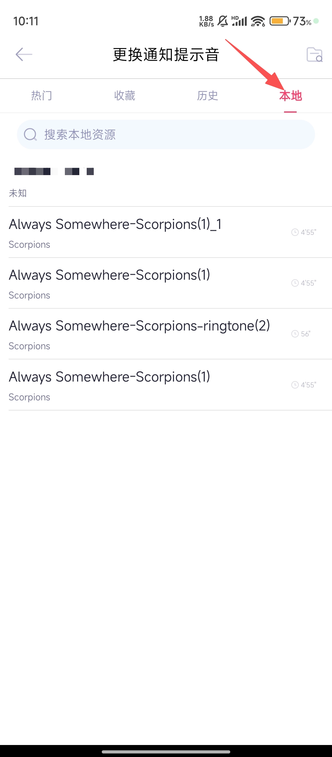在更换通知提示音的页面中,点击【本地】标签,就能查看手机本地存储的铃声资源了。