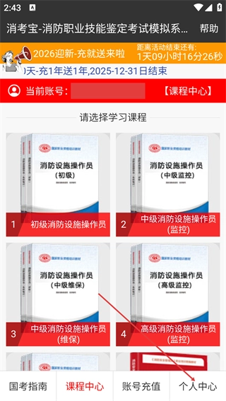 在课程中心页面,点击底部导航栏中的【个人中心】选项。