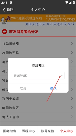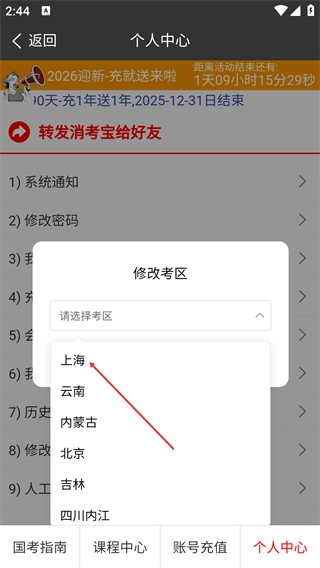 在个人中心页面,点击【修改考区】选项,系统会弹出修改考区的操作窗口。