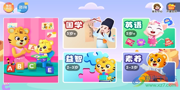 点击软件界面,能看到国学、素养、英语、益智这四种学习类型。