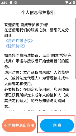 点击【同意】按钮,即表示您已阅读并确认【用户许可协议】与【隐私协议】,随后就能开启【皆成守护孩子端】服务的使用。