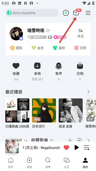 打开QQ音乐,进入“我的”页面,点击右上角那个带有99+标记的【消息】图标就可以啦。