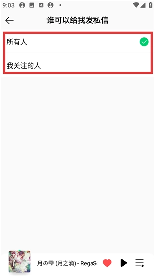 在这个页面中,选择【所有人】或者【我关注的人】,就能调整私信权限了。
