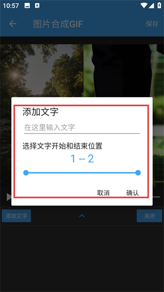 3、点【添加文字】后在输入框填内容,调起止位置,点确认就能给GIF加上文字啦。