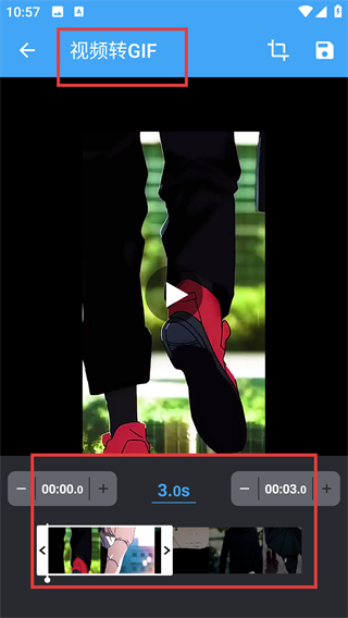 点击视频转gif选项,进入后选择你想要的视频文件,选择你想要的时间段后,点击右上角的保存按钮。