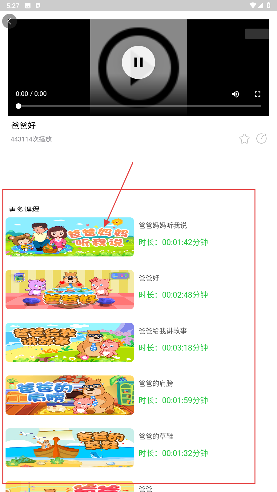 3、点击儿歌后进入播放页面,可播放儿歌,同时在【更多课程】中能看到其他相关儿歌推荐,点击可切换播放。