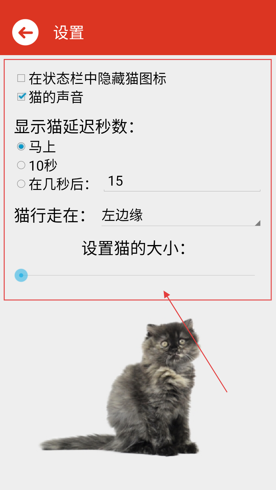 2、在设置界面中,找到【设置猫的大小】选项,通过滑动滑块来调整猫的大小,还可设置猫图标隐藏、声音、延迟显示秒数及行走位置等。