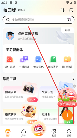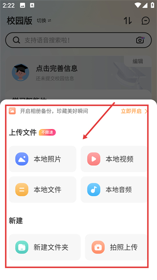 1、在校园版首页点击右下角的加号按钮,即可打开上传选项菜单,为上传各类本地文件做好准备。