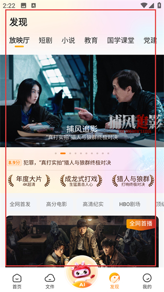 3、点击底部的【发现】选项,即可进入发现页面,在放映厅分类下浏览各类影视内容。