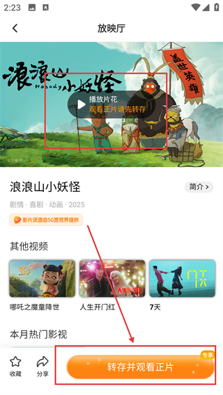 4、在放映厅页面挑选好想要观看的影片后,点击【转存并观看正片】按钮,即可完成转存并观看该影片。