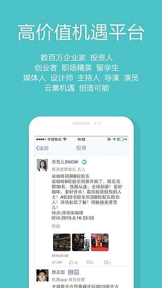 2.机遇汇聚了数百万高价值用户,涵盖了企业家、投资人、创业者、职场精英等多个领域,为用户提供了丰富的人脉资源。