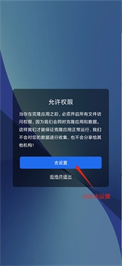 1、在本站下载并安装该软件后,打开软件会弹出权限允许窗口,由于克隆应用需要开启部分必要权限,因此点击【去设置】进入权限设置界面;