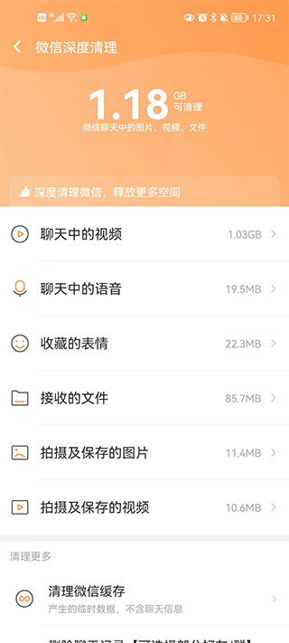 7、智能微信清理功能,可对聊天过程中产生的遗留缓存、朋友圈图片缓存以及微信的音频和视频缓存进行清理,助力手机提升运行速度。