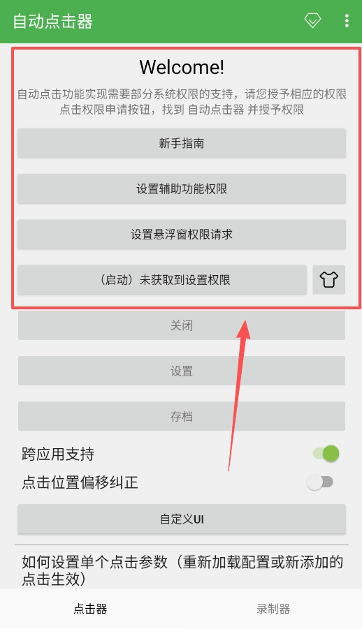 首先启动自动点击器应用,在欢迎界面点击权限申请按钮,系统会跳转至辅助功能设置页面,完成这一步后基本功能就能正常运行啦。