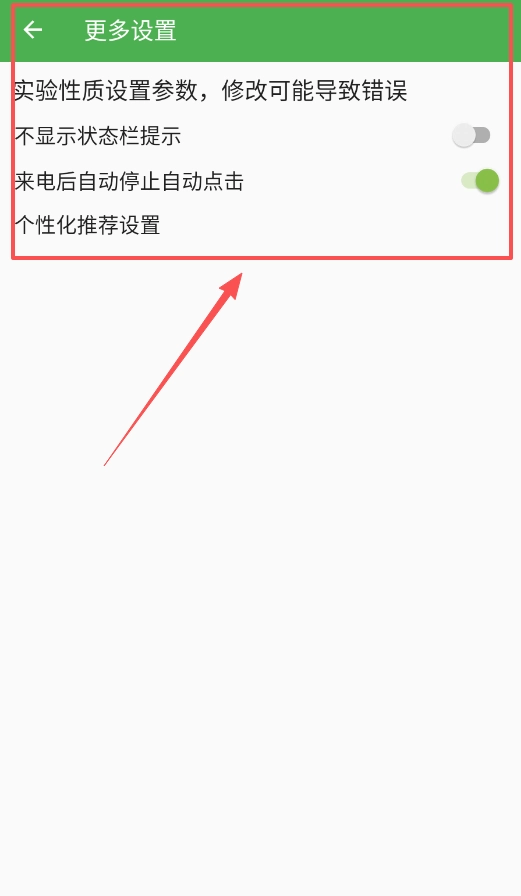 在更多设置里有几个实用的选项,像来电后自动停止点击能防止操作冲突,个性化推荐设置可以提升使用体验。