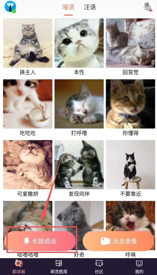 打开软件后,在主界面底部找到并点击翻译器功能,接着选择喵语或汪语模式,然后长按录音键录制宠物的叫声,像呼噜声或者好奇时发出的声音都可以。