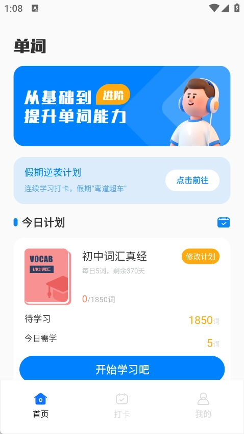 首页整合了单词学习助手功能,用户可以自定义记单词计划,系统会科学规划学习节奏。