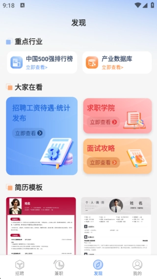 在发现页面,你能够获取重点行业资讯、简历模板资源,以及招聘薪资待遇统计发布、求职学院课程和面试攻略技巧等相关信息。