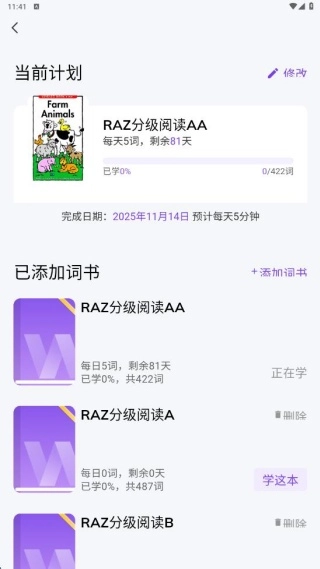 首页呈现了多样的学习形式,能够依据计划每日进行单词背诵。