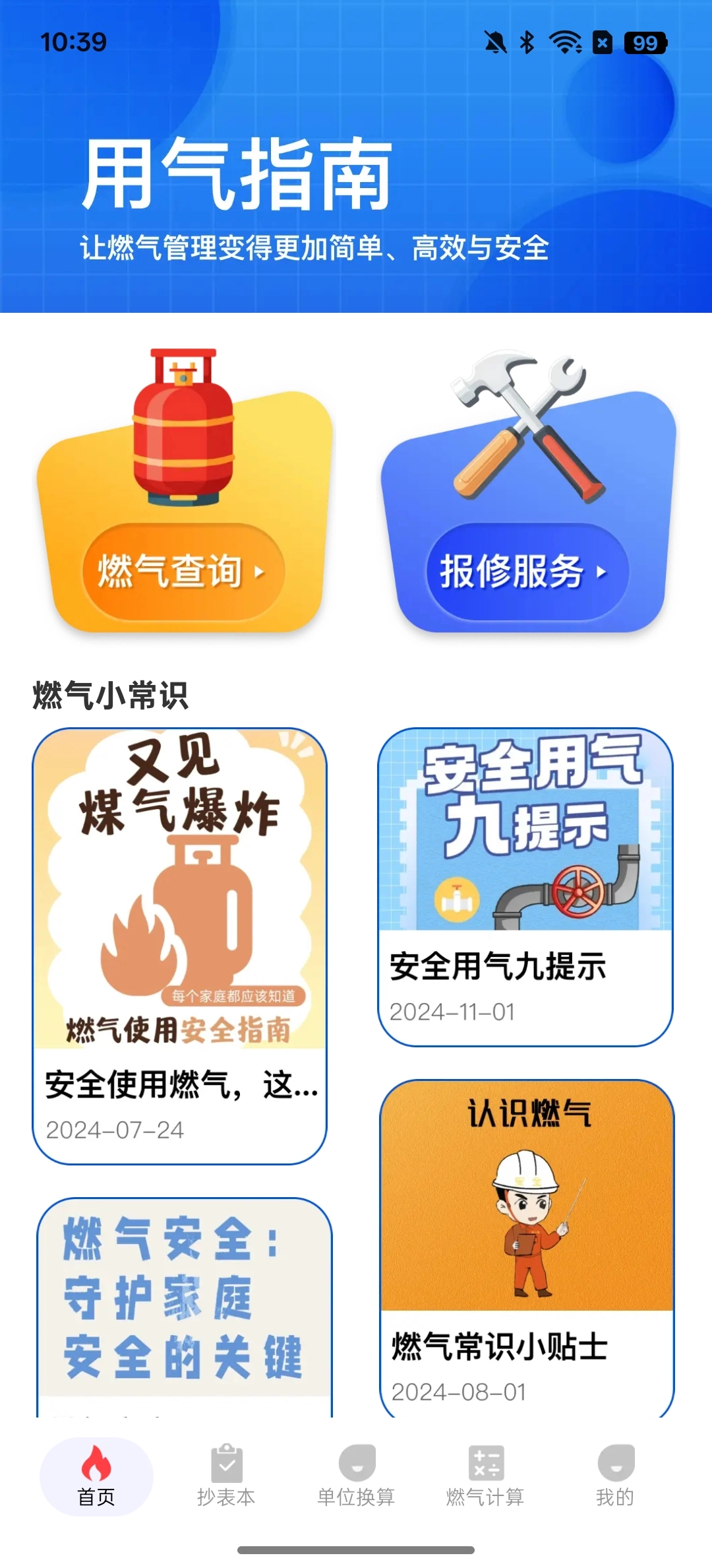 页面显眼位置设有醒目的“燃气查询”与“燃气报修”按钮,用户点击即可快速进入对应功能页面;此外还包含各类用气小常识,页面下方则整齐排列着“燃气计算”“单位换算”等实用功能入口。