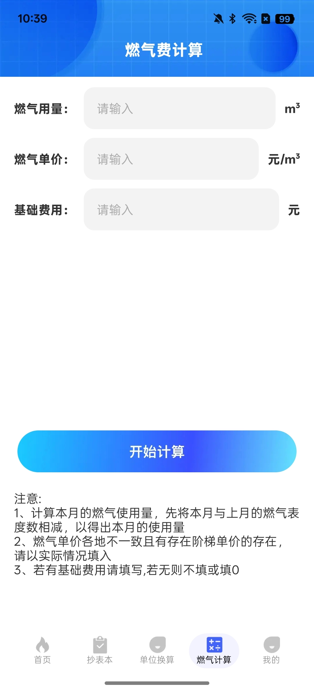 燃气计算功能十分便捷,用户只需输入燃气用量、单价和基础费用这三项信息,就能清晰了解自己的用气情况,还能精准估算燃气消耗!
