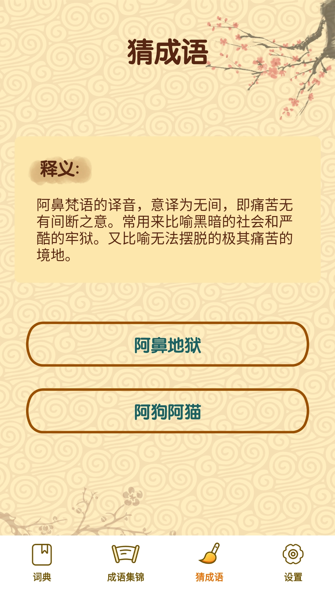 2、进入“猜成语”界面后,依据给出的释义挑选对应的成语就行啦。