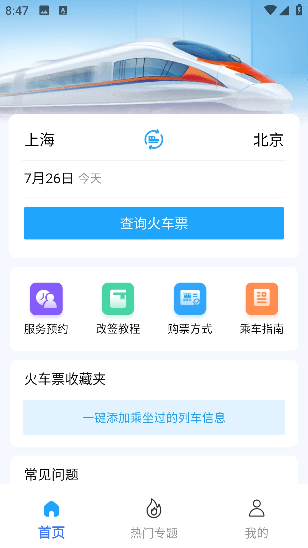 3、首页会呈现热门线路的发车时间、余票数量等重要信息,用户不用输入任何内容,就能直观清晰地知晓当前的火车票状况。