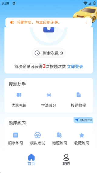 在首页向下滑动,就能看到搜题助手和题库练习这两大版块。其中,搜题助手涵盖优惠充值、学法减分与搜题教程;题库练习则包含顺序练习、模拟练习、错题练习以及收藏练习。